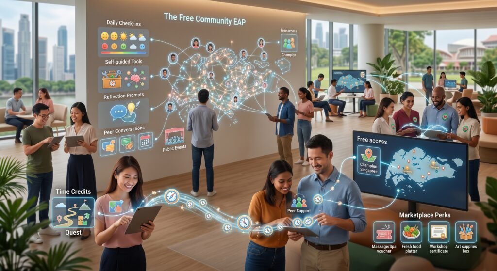 The Free Community EAP. A no-cost digital space that extends the Well-being Champions Network to every employee in a member organisation. Self-guided tools, daily check-ins, and reflection prompts sit alongside peer conversations, public events, and connection with others across Singapore who care about workplace well-being. Designed to complement, not replace, any EAP your employer already provides.